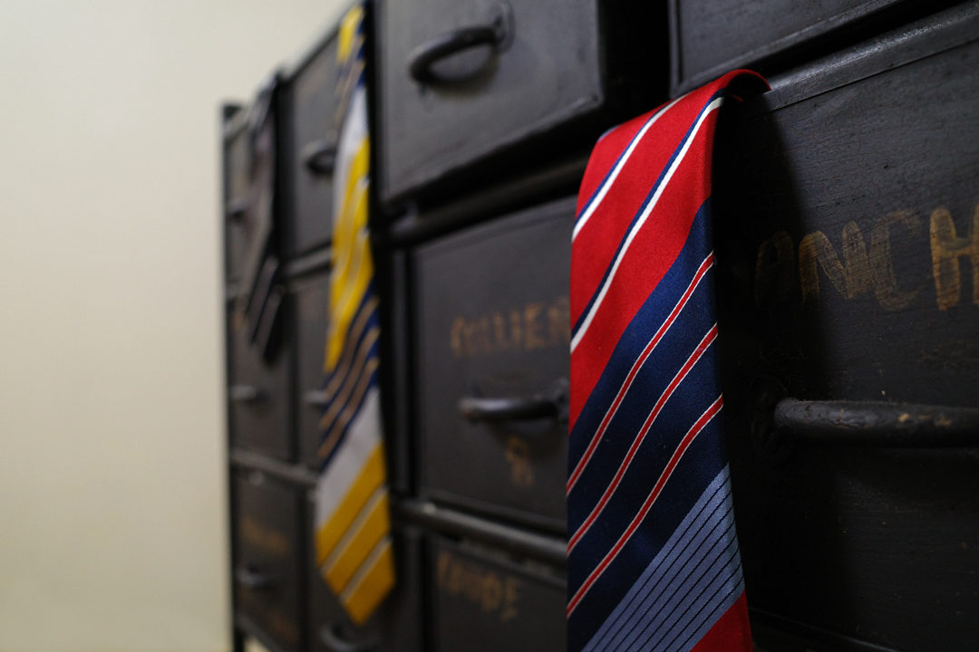イエローベースのネクタイに使っている紺とレッドベースに使っている紺とでは違う紺色を使っています。