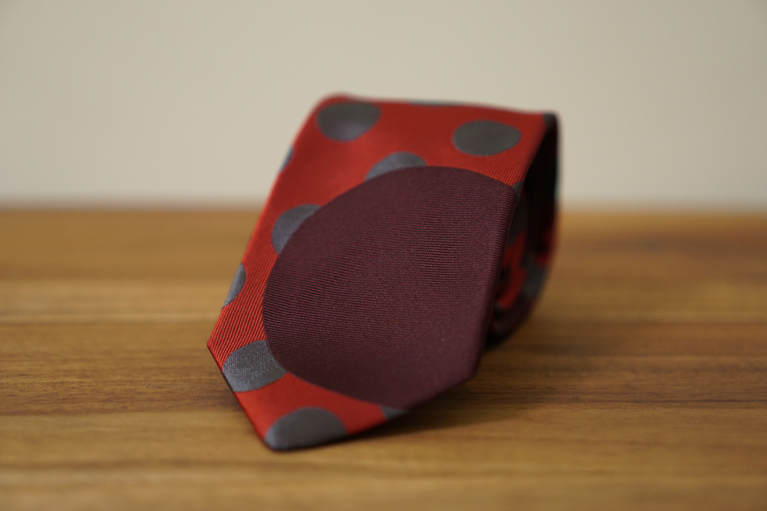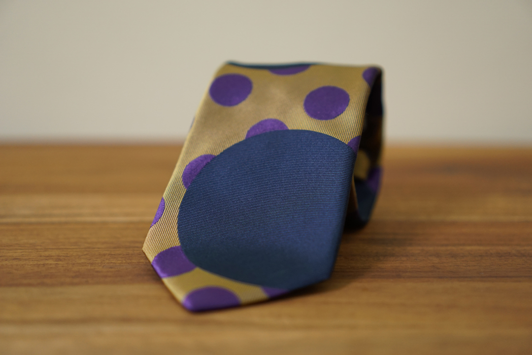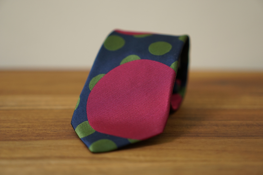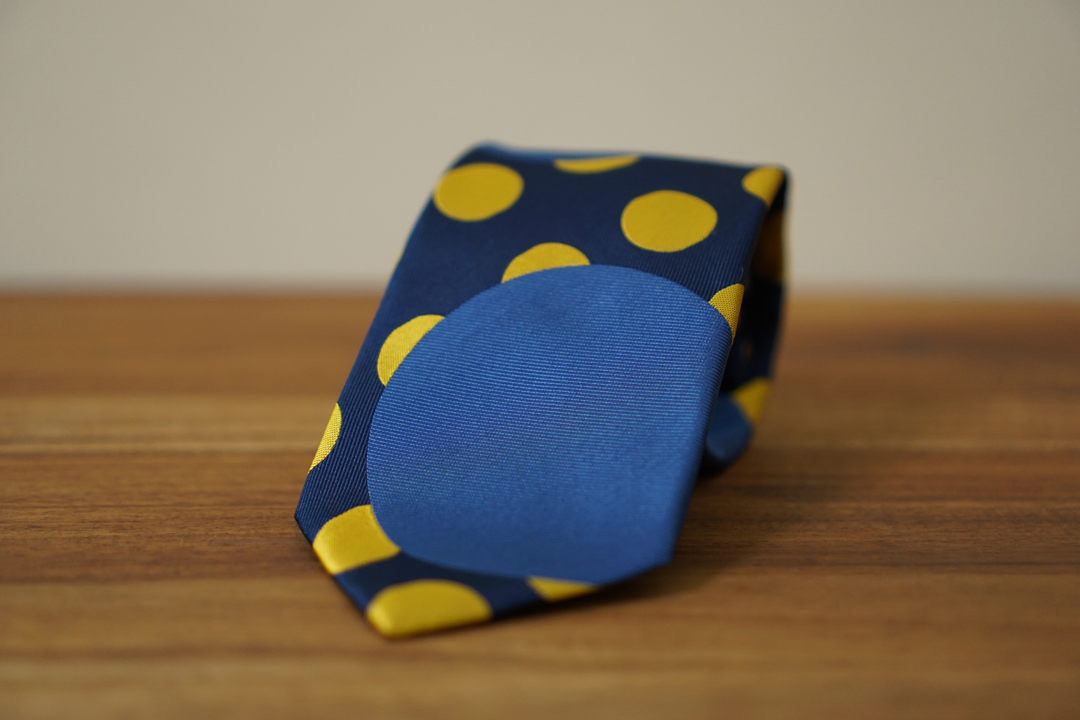 柄のデザインは大胆にでありながら大きなドットがネクタイの中心に並んでしまわないように配置しました